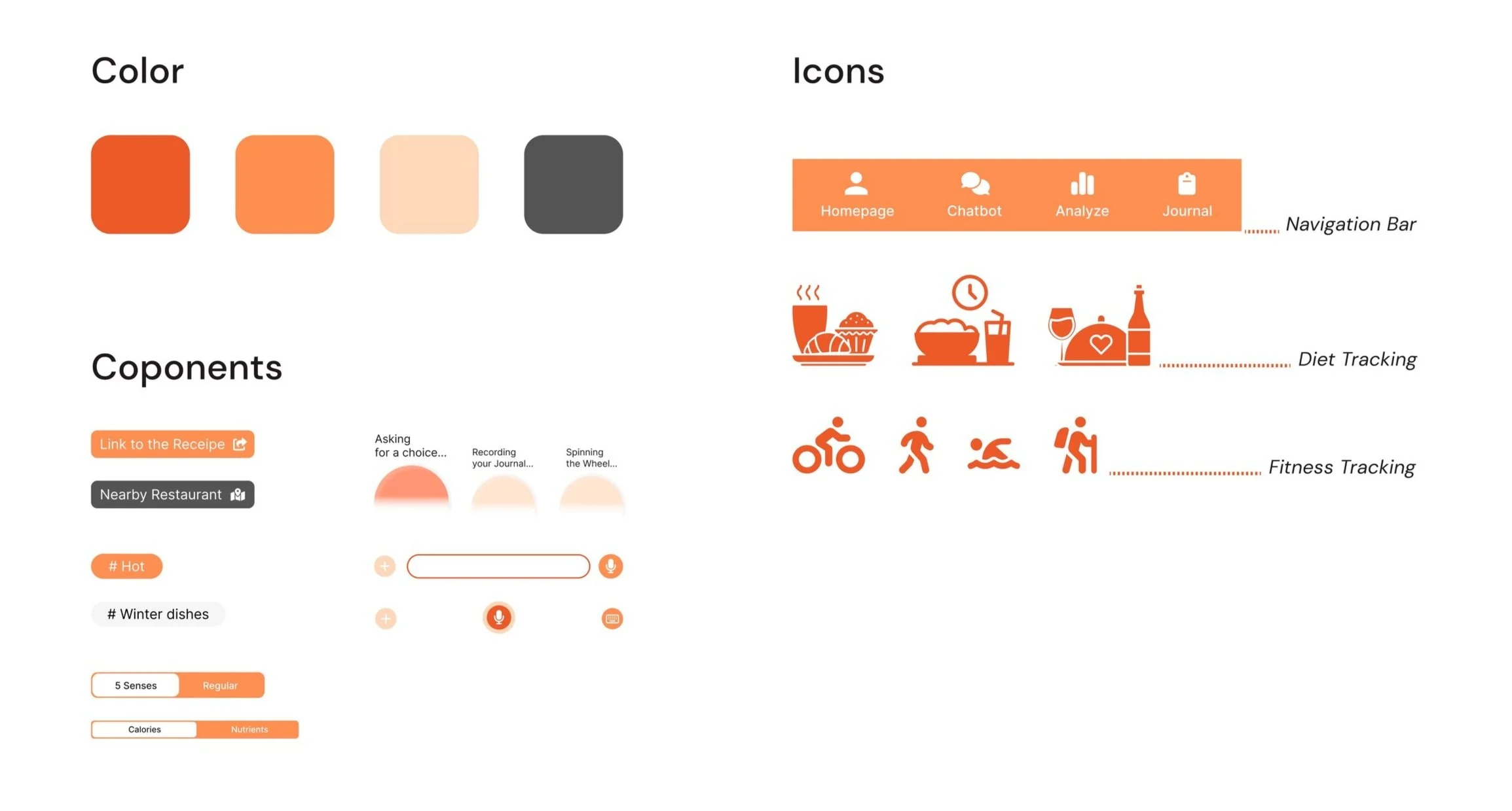 These are the design elements that constructed our app. The initial model of the app used more toned down cool colors but after feedback we decided that warm color palette would be more fitting for our culinary concept.