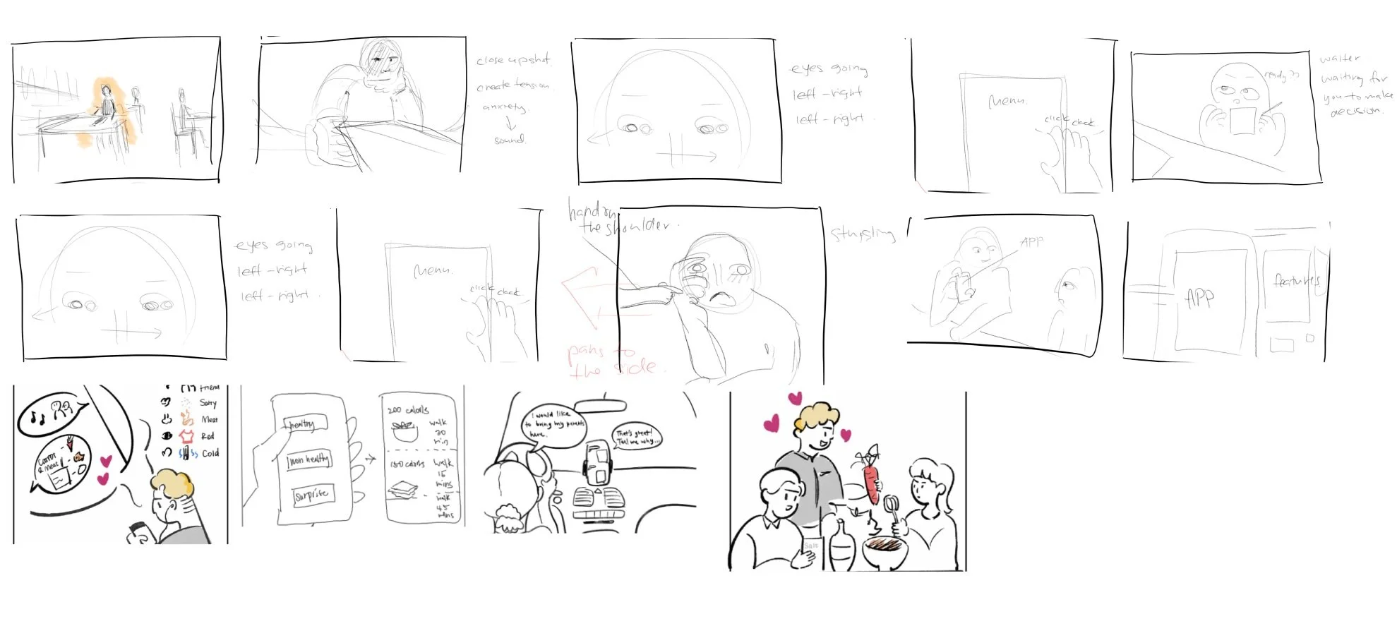 Using the takeaways from our interviews and generative research, we started to work towards our final product design. We first started by drawing out different storyboards scenarios dealt with different dining experience.